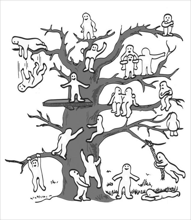 Інструкція: Роздрукуйте аркуші із зображенням дерева та роздайте школярам. Поясніть дітям, що на цьому дереві живе спільнота лісових чоловічків, кожен з яких має свій настрій, займається своєю улюбленою справою та займає відповідне положення на дереві. Попросіть кожного учня обвести на своєму аркуші червоним кольором того чоловічка, з яким він ототожнює себе зараз, та зеленим – яким би йому хотілося бути.