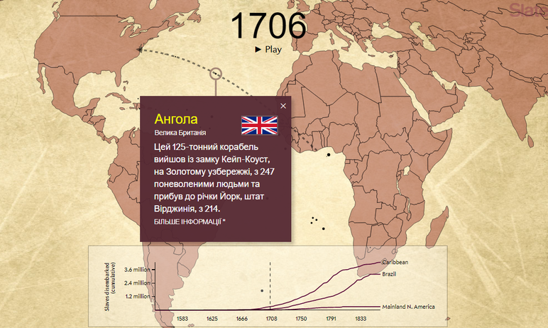 Slate – інтерактивна карта, у межах якої анімаційно відтворено переміщення суден з рабами з африканського континенту до Нового Світу упродовж 315 років. Загалом візуалізовано інформацію з понад 20 тис. відомих різноманітних рейсів транспортування рабів.