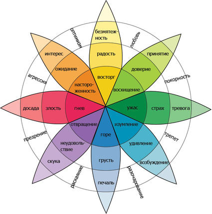 Американський професор Робер Плутчик у 1980 році придумав концепцію, в якій окреслив 8 основних емоцій, пов’язаних з більш складними. У результаті вийшло «колесо емоцій».