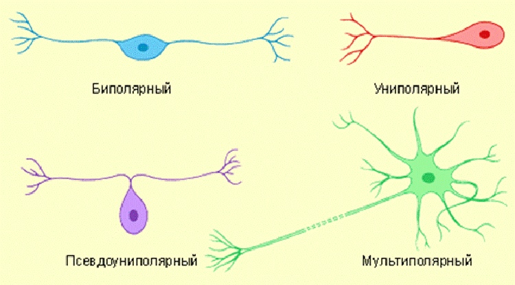 Вспомните, что мы говорили про один длинный аксон и короткие дендриты. Так вот, этот вид нейронов называется мультиполярным, и он — самый «популярный», однако, есть и другие: униполярные (всего один отросток), биполярные (два отростка) и псевдоуниполярные (один отросток, который потом делится на два). Есть и вовсе аполярные(«голые») нейроны. Это предшественники нервных клеток – нейробласты.